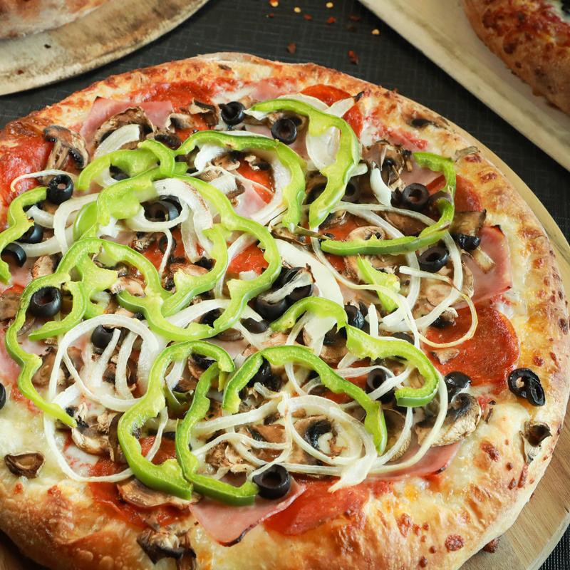 Pepperoni, ham, mushrooms, olives, green peppers, onions.
